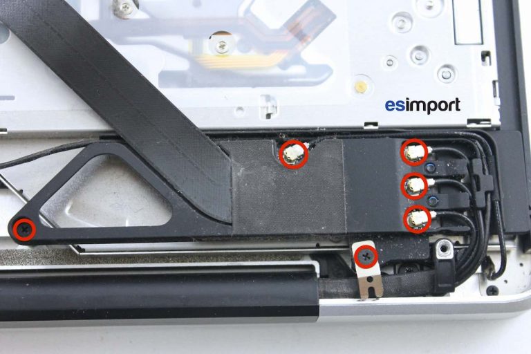 Dévisser les 2 vis du berceau des antennes wifi/bluetooth. Avec le spudger, déconnecter chaque antenne et déposer le berceau :