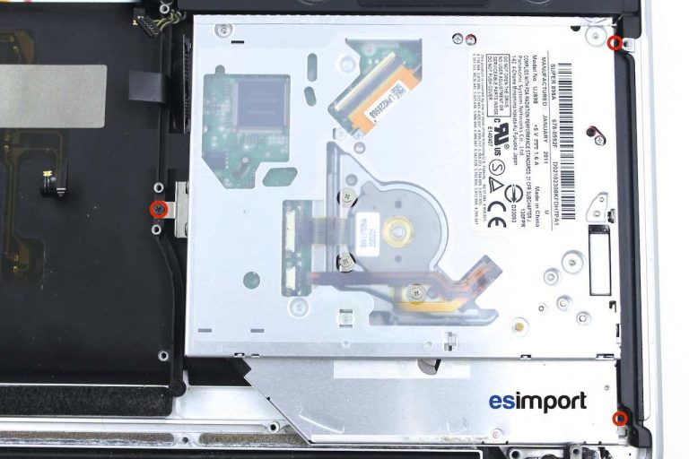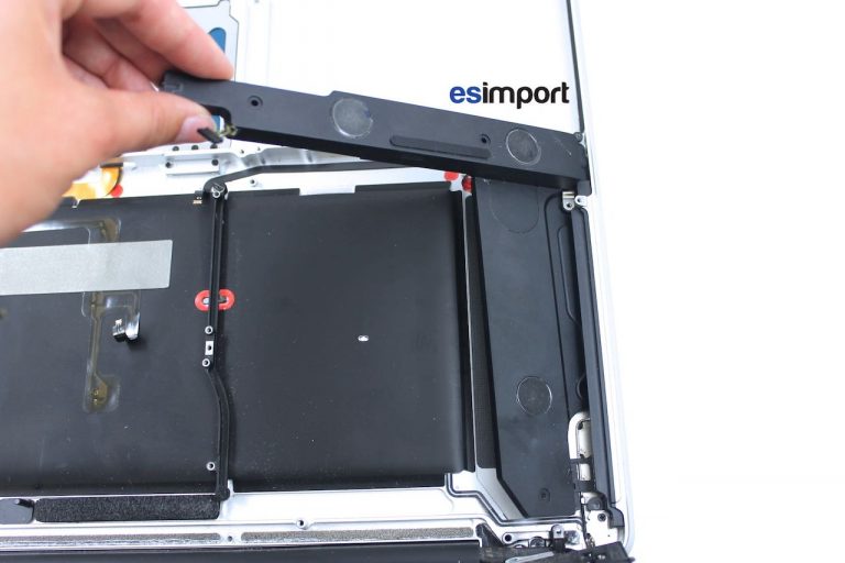 Dévisser les 2 vis cruciformes du berceau des antennes wifi/bluetooth. Il n’est pas nécessaire de le déposer entièrement, il suffit de le basculer simplement vers soi et de le soulever du lecteur optique CD ROM: