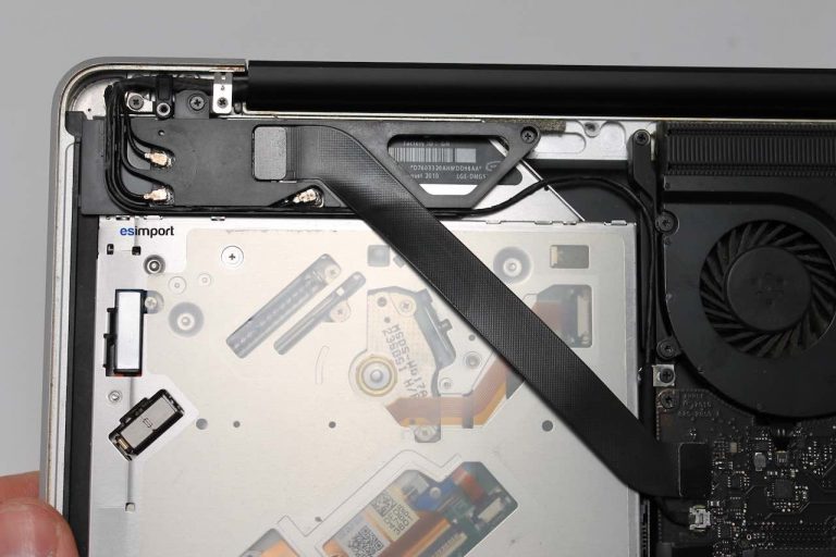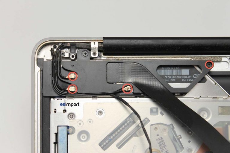Attention au cheminement des connecteurs WIFI: la longueur des brins devrait être repérée pour déterminer l’ordre de branchement. Utiliser le spudger pour bien placer et enfoncer les câbles dans leur logement :
