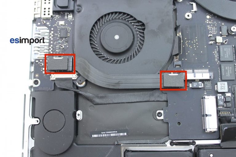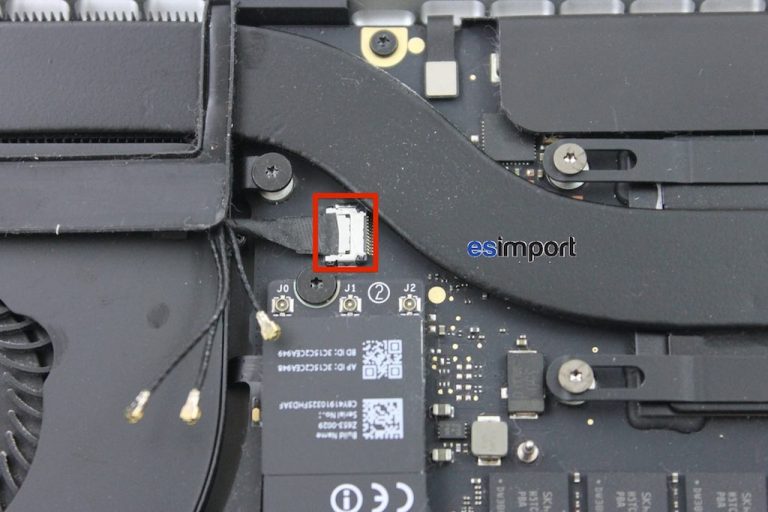 Sous l’adhésif noir se trouvent des connecteurs. Sur la carte-mère du macbook, Déconnecter en premier celui de la batterie afin d’éviter tout court-circuit sur la carte-mère. Déconnecter ensuite le haut-parleur droit ainsi que le trackpad avec le spudger pour ne pas l’endommager :