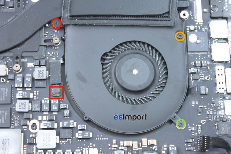 Déconnecter le câble du ventilateur gauche puis retirer les 3 vis qui le fixent à la carte-mère. Bien noter les tailles différentes des vis pour faciliter le remontage. Déposer le ventilateur de la carte-mère :
